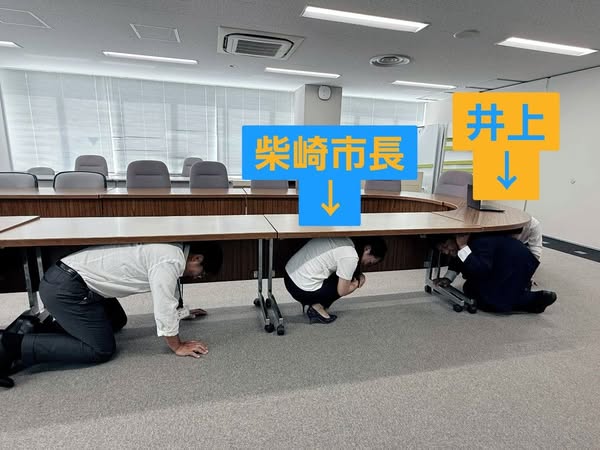 本日、午後2時に市役所で訓練放送があり、職員の皆さんが一斉に机の下に潜ります。