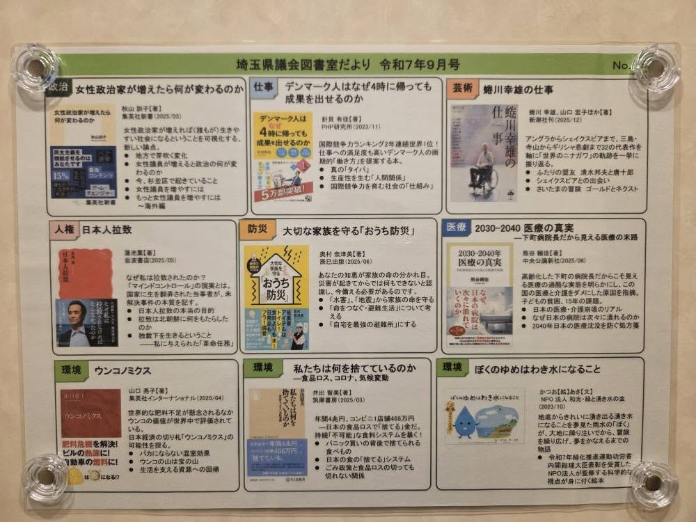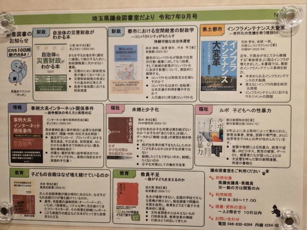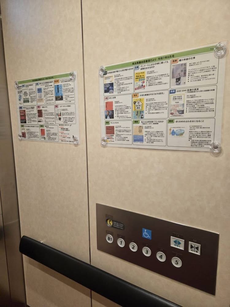 県議会議事堂内のエレベーターには、図書室が発行する「図書室だより」がラミネートして貼られています。
