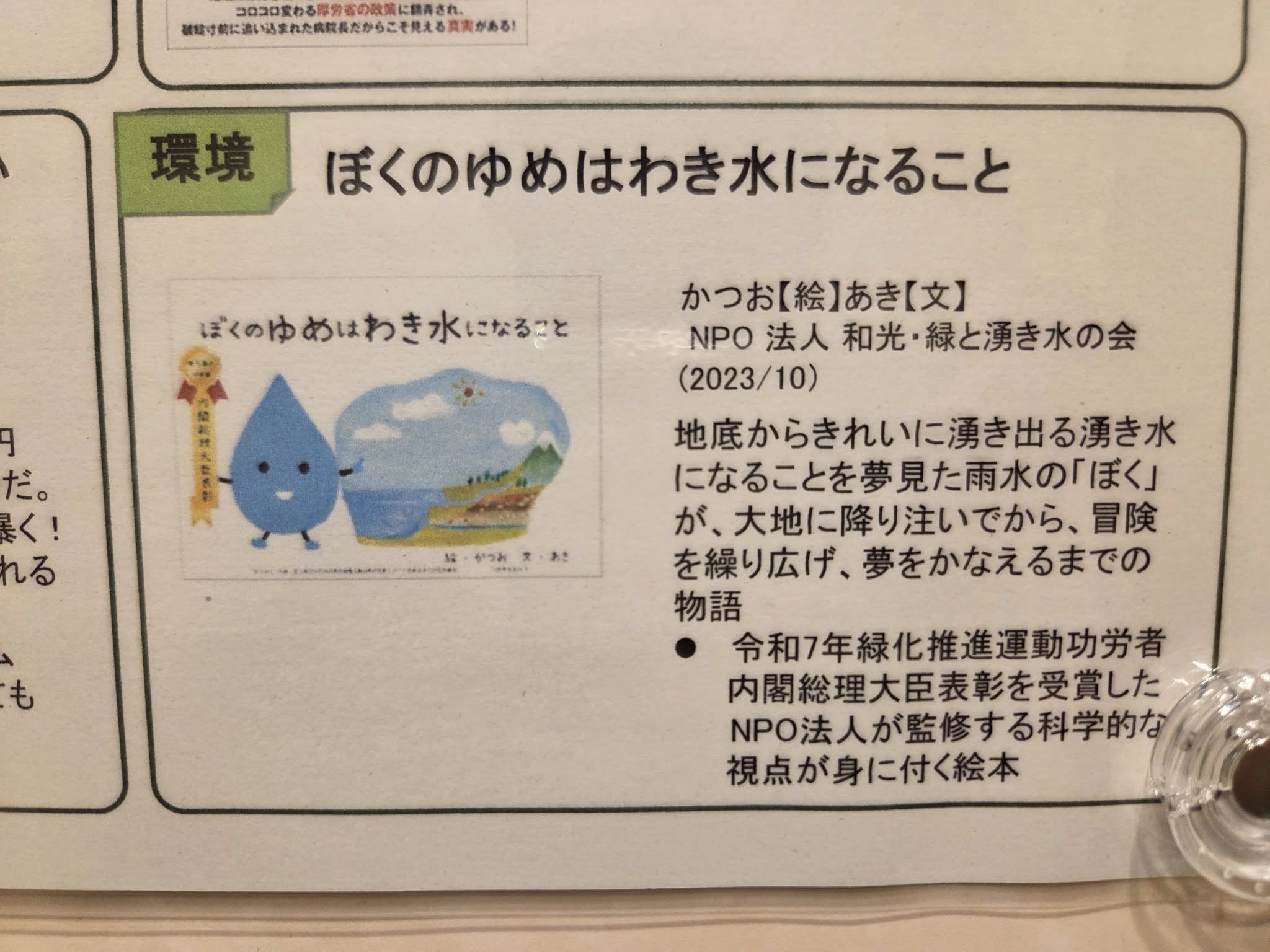 その中で紹介されたうちの1冊に、和光市のNPO「和光・緑と湧き水の会」が発行した『ぼくのゆめはわき水になること』が紹介されています。