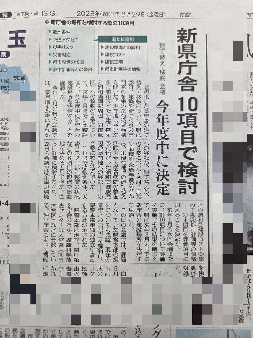 県庁舎の最も古い部分が築80年を迎える2032年へ向けて、県庁舎再整備の議論が始まっています。位置については現在地又は浦和美園への移転のどちらになるかが、執行部から今年度中に方向性が出されることとなっております。当然、移転ともなれば、現在約6,000人の職員さんが勤務しているこの浦和の町にとって影響は大きいものとなります。