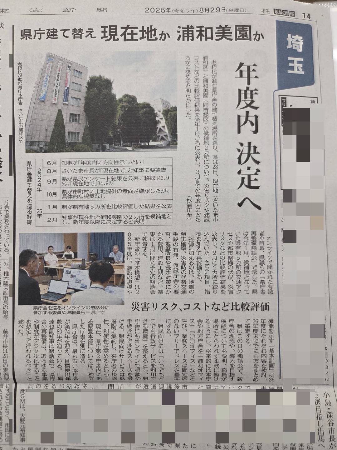 自民党議員団は、今年2月の代表質問(=田村団長)で「浦和美園に移転したと仮定して現在地の跡地利用」といった切り口で、この県庁建て替え問題を論じたり、一般質問でも「浦和美園推し」の議員が居たりと、会派全体の意向としては浦和美園推しの雰囲気を醸し出しています。