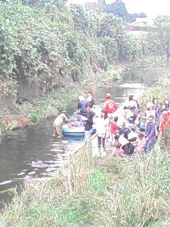 ゴムボートを浮かべ、子どもたちが乗り込んでいました。