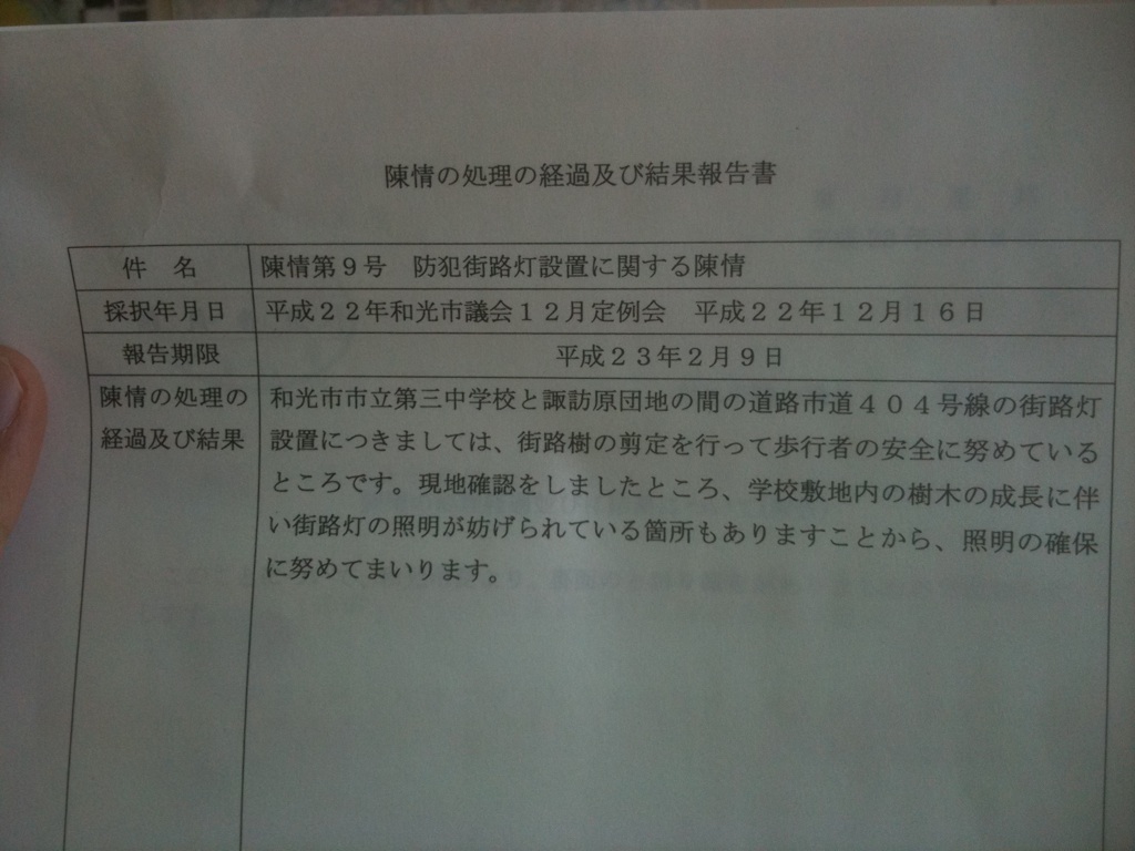 「防犯街路灯設置に関する陳情」
