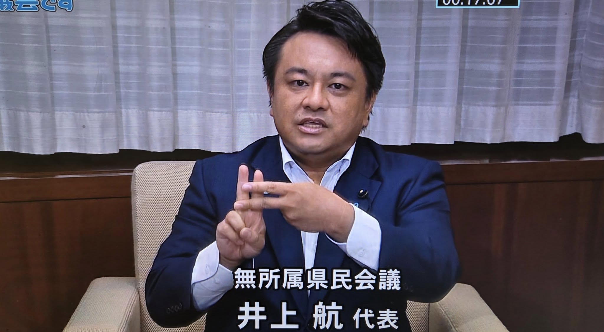 「皆さま、こんにちは。無所属県民会議 代表の井上航です。私たちは主要会派の中で、唯一、特定の政党に属さない無所属議員で構成された会派です。よろしくお願い致します。」