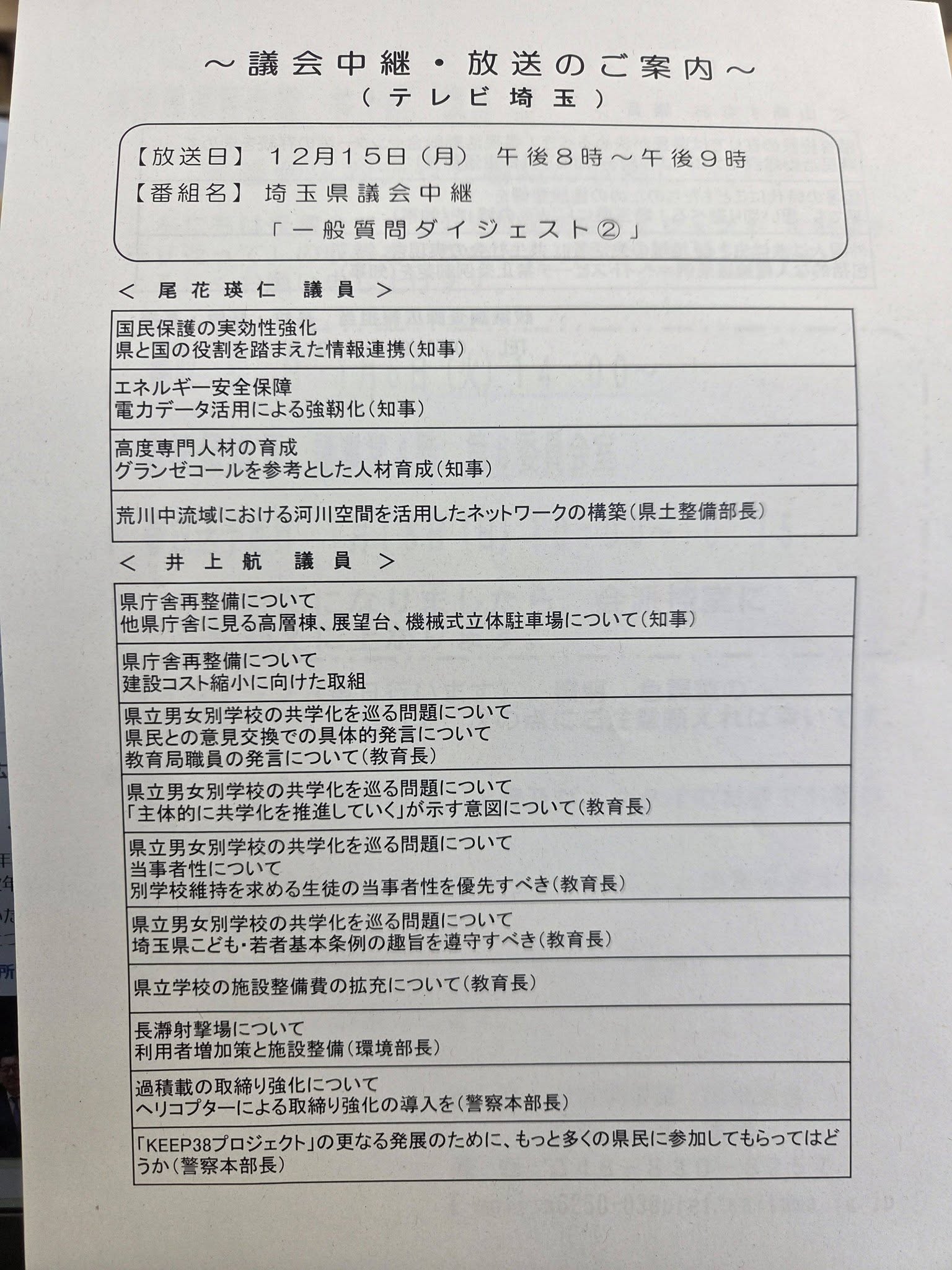 一般質問が終わると1週間後くらいにテレビ埼玉でその模様の一部が放送されます。