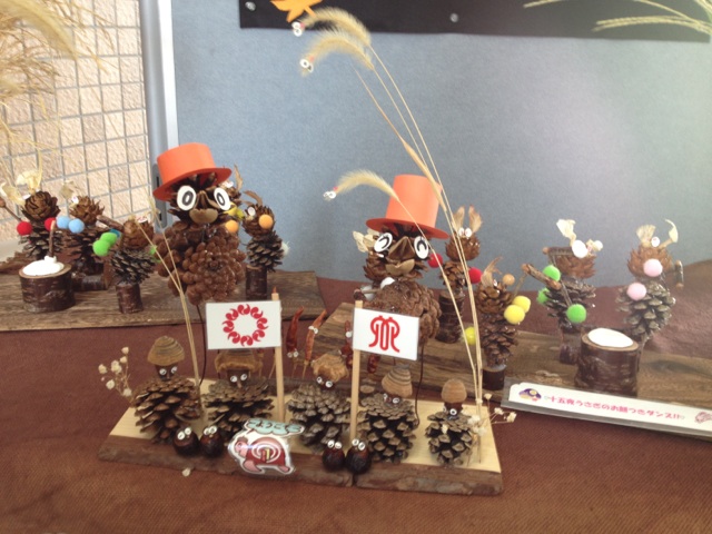 松ぼっくりを使って埼玉県の県旗を模した飾りを