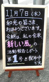 下の写真は、今日の駅立ちで使った看板です。