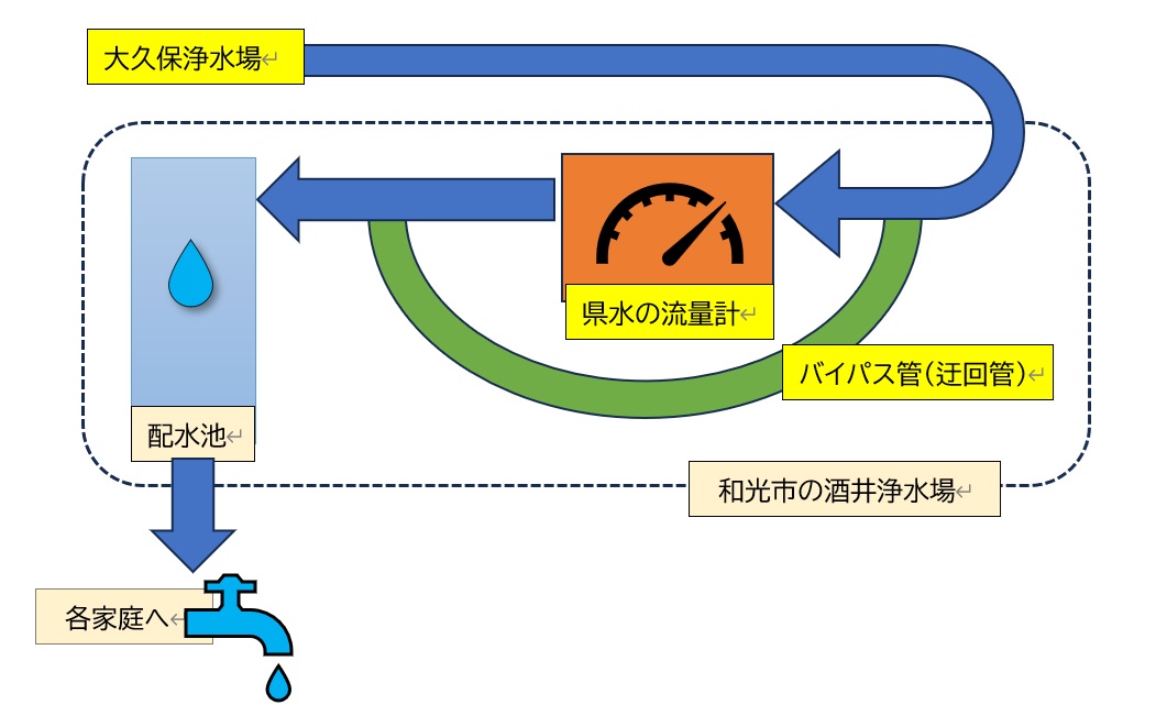 ・濁り水が起きた、11月11日は大久保浄水場の定期点検を行う日でした。そこで和光市水道課では、それに合わせて、普段は県水が送られ続けてきているため、出来ない酒井浄水場内の、普段は使わない「バイパス管」を洗浄することにしました。(図の緑色の管の部分)