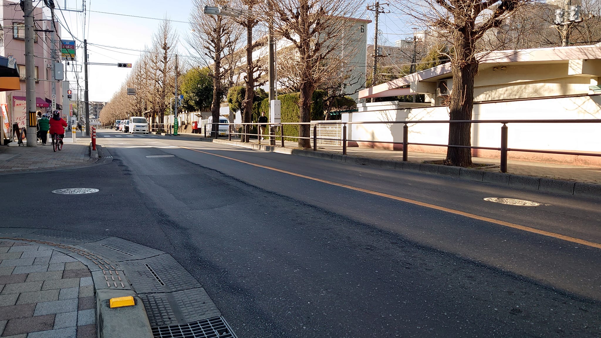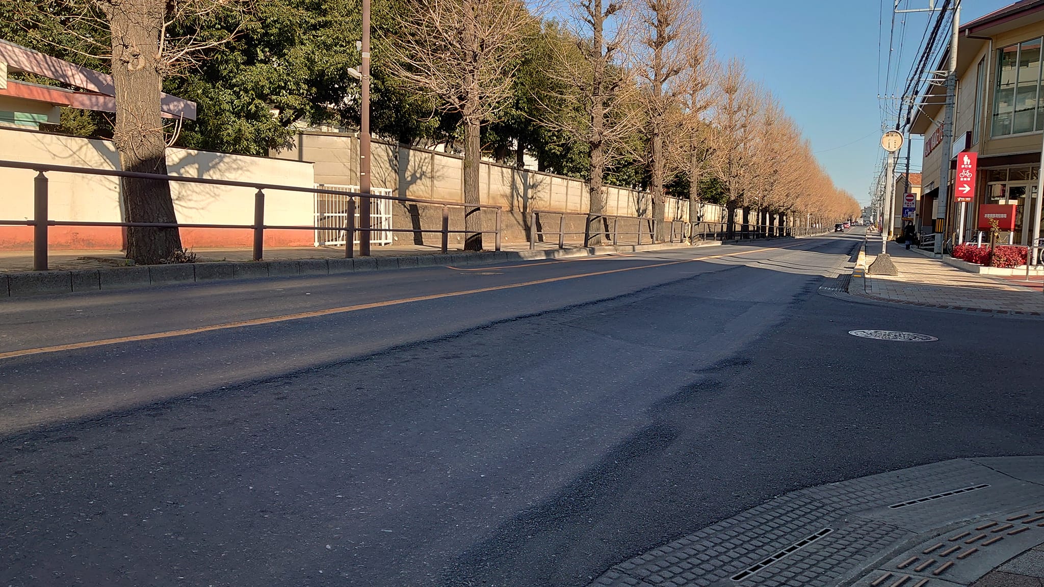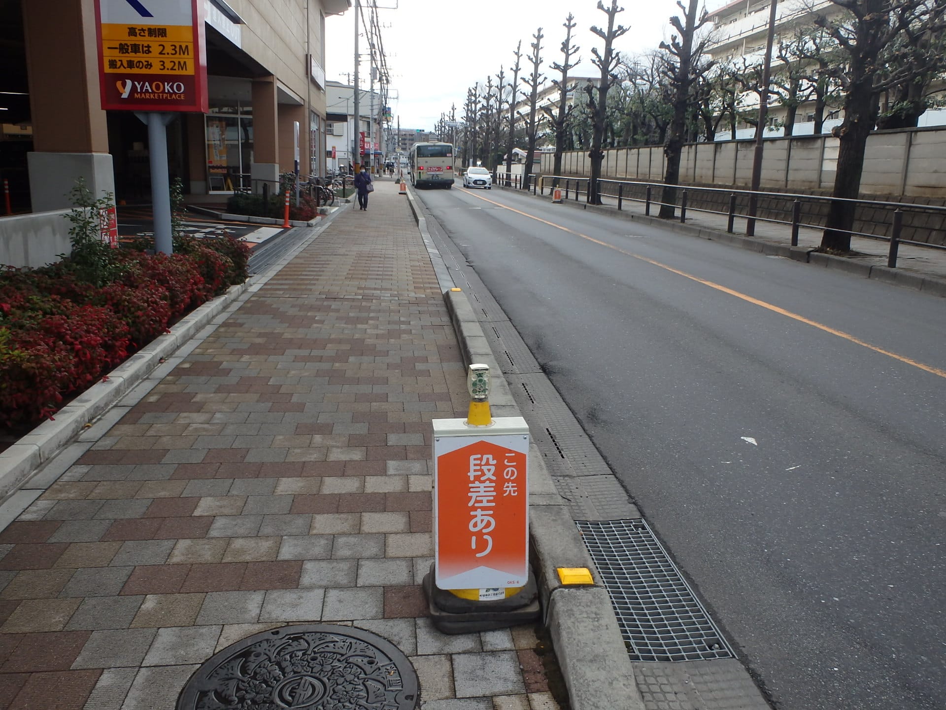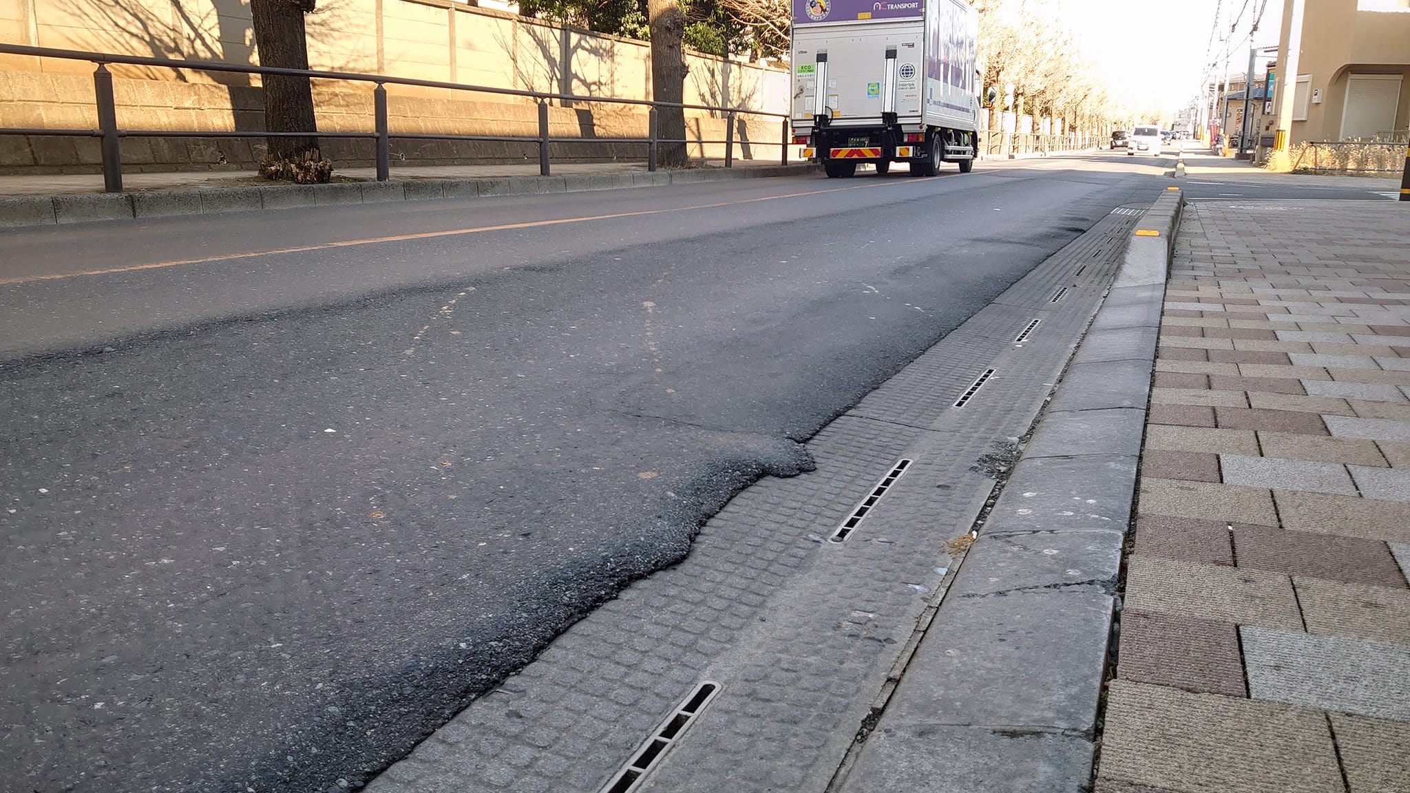 実はこの箇所、車道のアスファルトが波打ち、特に歩道寄りの部分はアスファルトが流れ出たように凸凹になっています。
