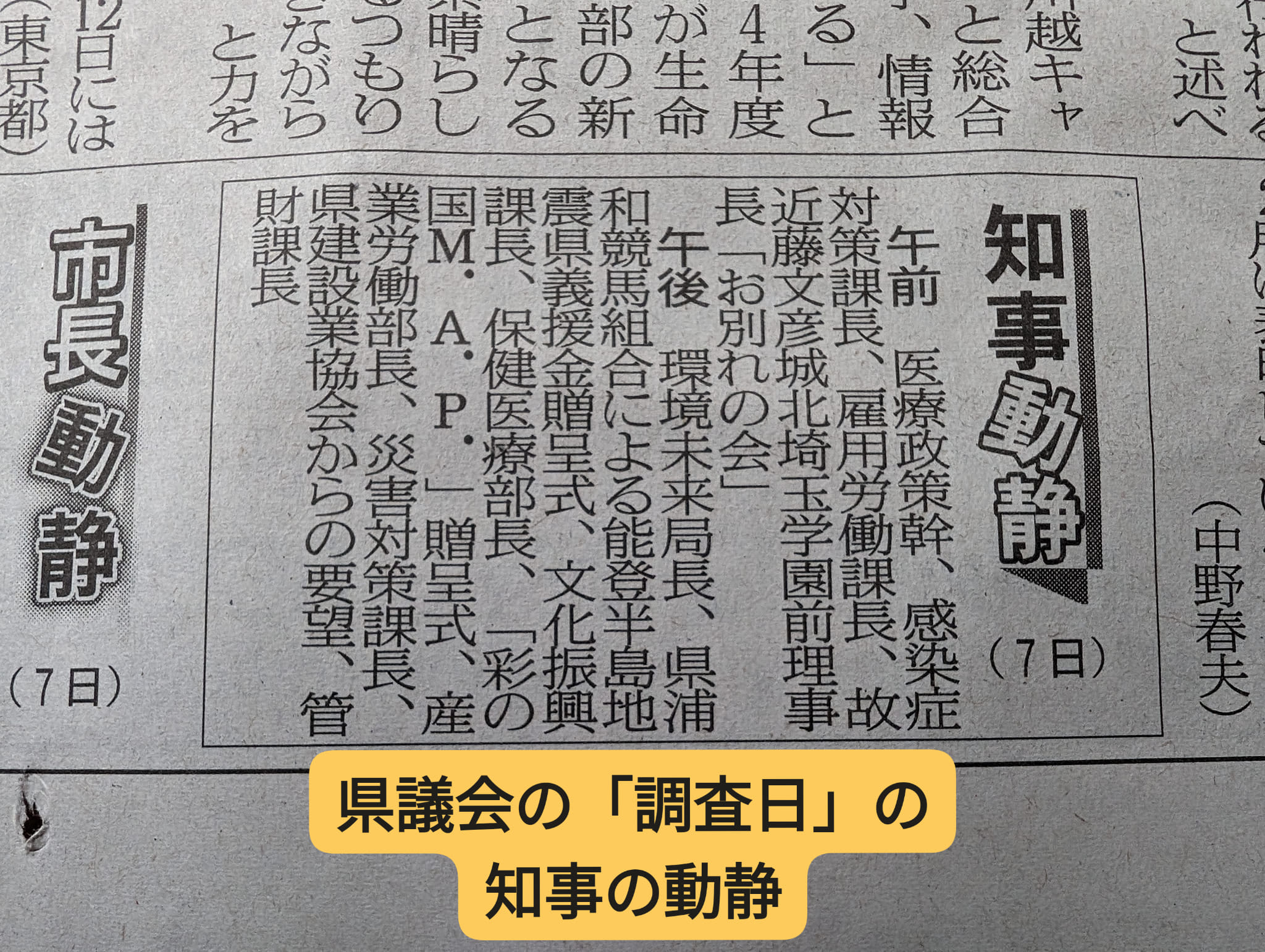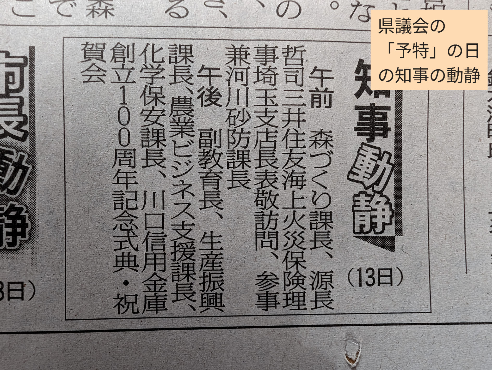 そのため、知事は公務を入れています。例えば予算特別委員会をやっていた3月13日(水)は「庁内会議」だけでなく、「表敬訪問」を受けたり、川口信用金庫創立100周年の「記念式典」や「祝賀会」に出席されています。