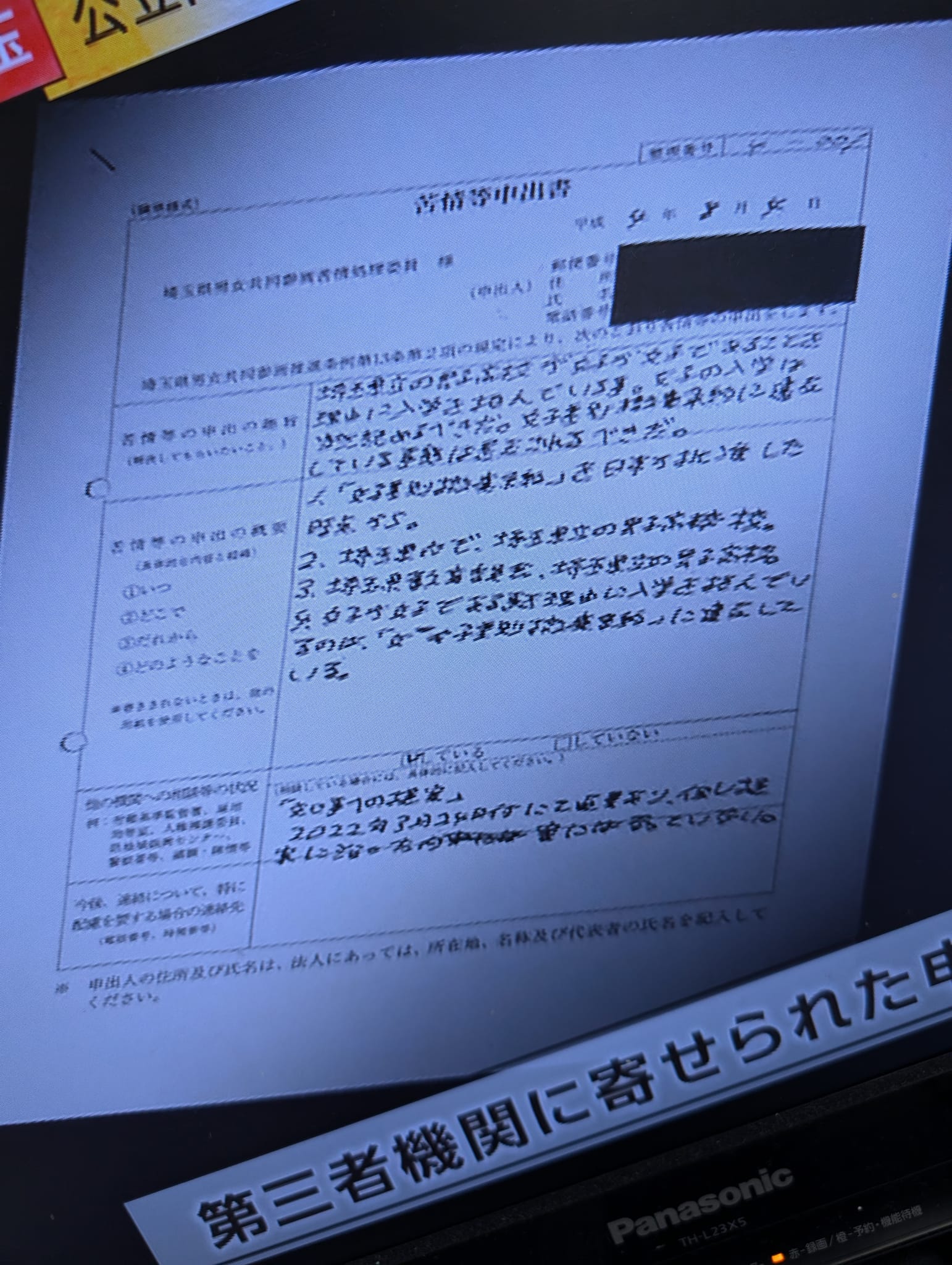 「首都圏情報ネタドリ」というNHKの番組では、その苦情申立書の写しも映像に流れましたが(写真参照)、本当にシンプルな数行の書かれただけの申立書です。