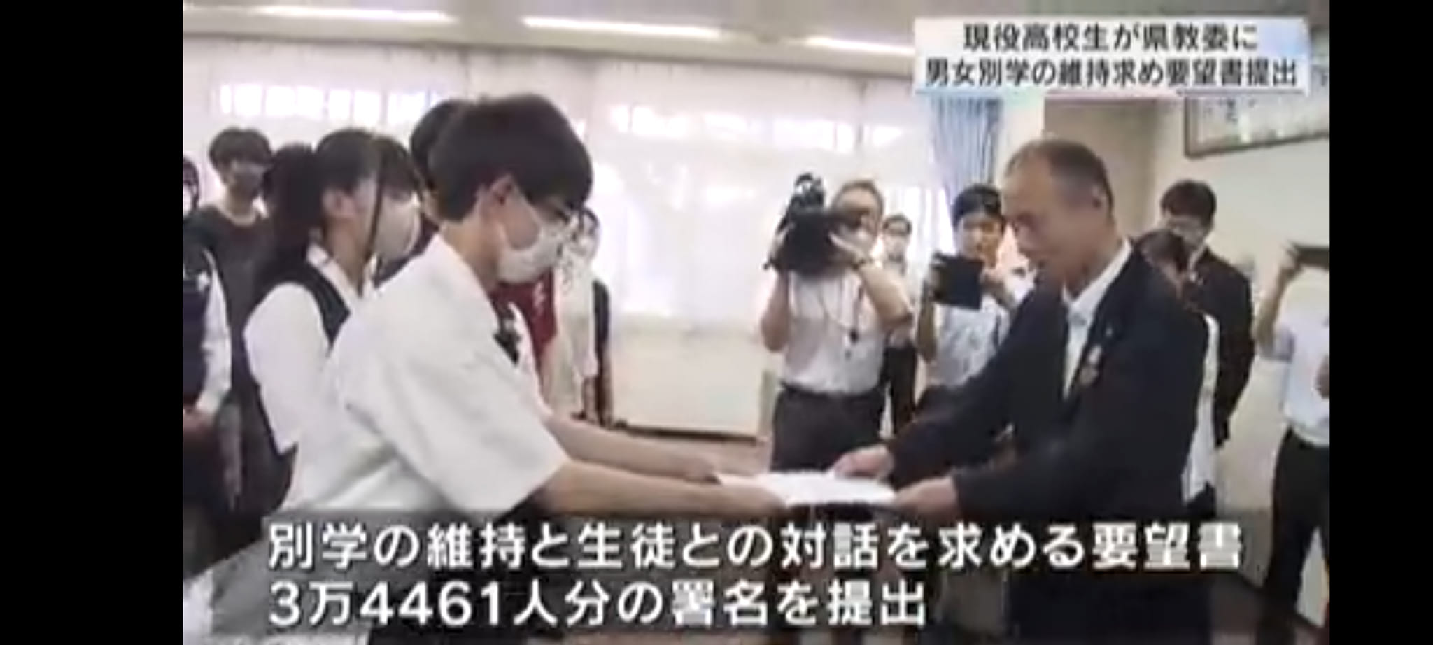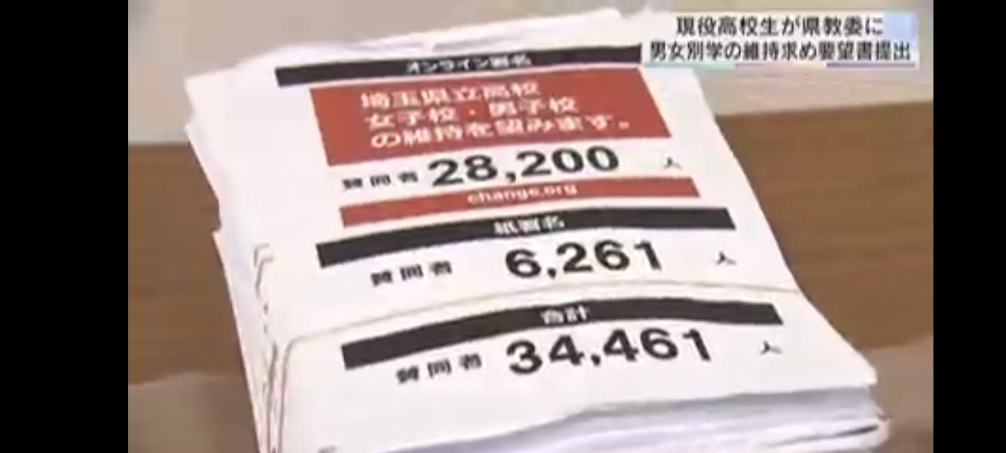 既にテレビなどでは報道されていますが、共学化に反対する高校生が埼玉県庁を訪れ、3万人余りの署名ととともに生徒との対話を求める要望書を提出しました。