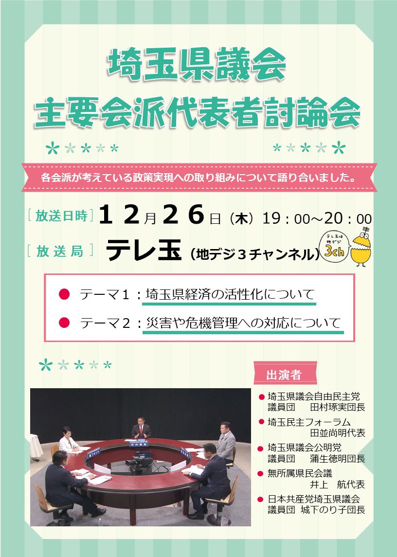 【テレビ番組】令和6年12月26日(木)午後7時からテレビ埼玉(地デジ3ch)で「埼玉県議会主要会派代表者討論会」を放送します!