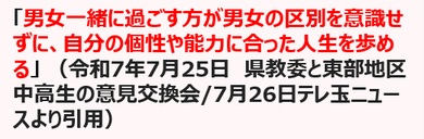 ・一方、県教委の真意は「自分の個性や能力に合った人生を歩むという『目的』を果たしたくば「男女一緒に過ごす」という『行動』をせよ、である