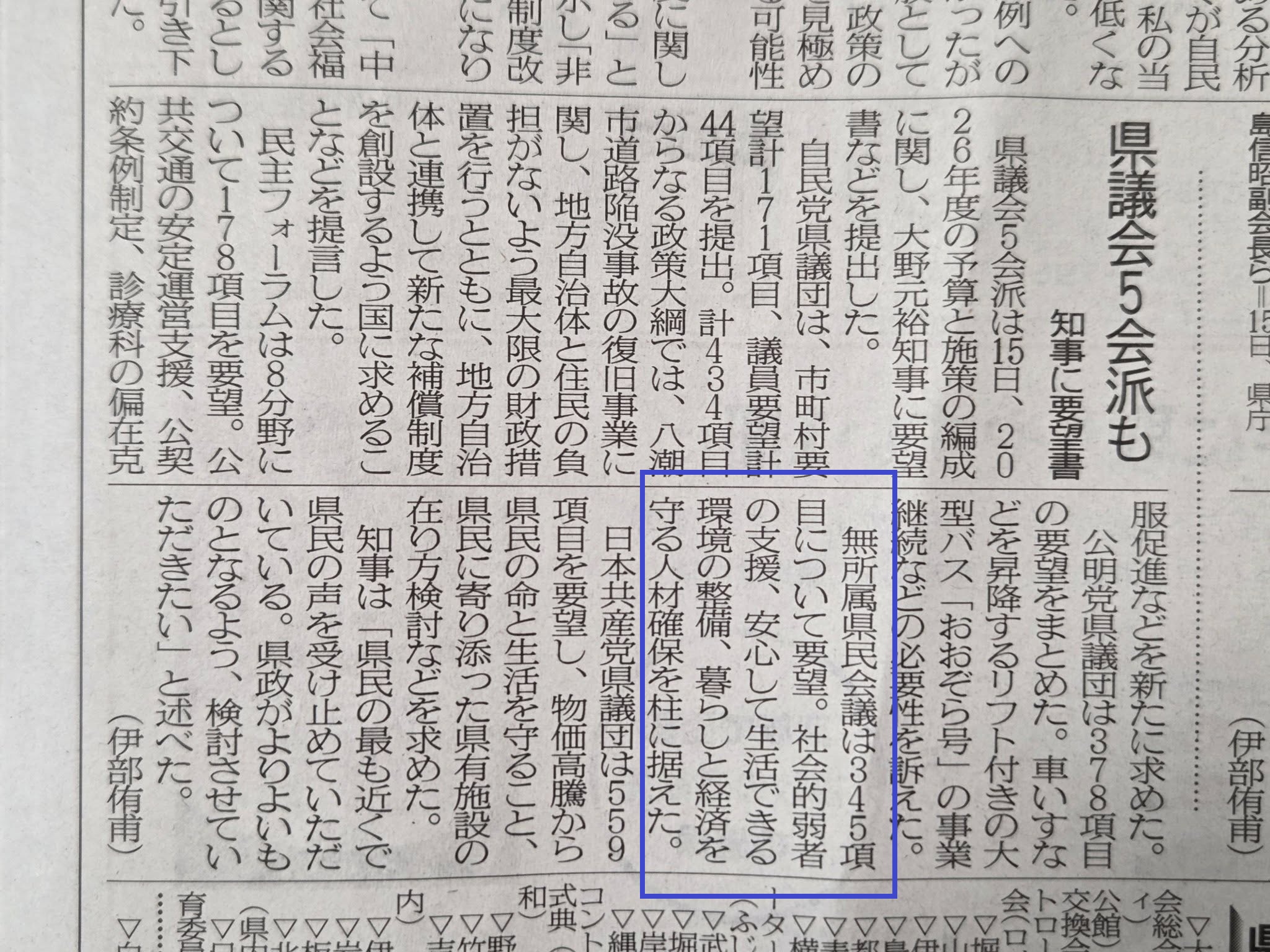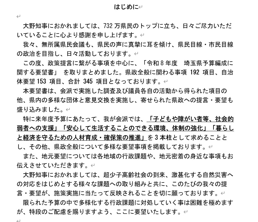 そして、会派「無所属県民会議」の活動としては、昨日、大野知事 に来年度予算要望書を提出しました。