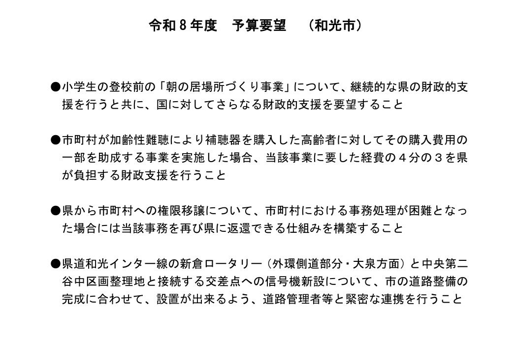様々な団体やそれぞれの地元自治体(もちろん和光市からの要望も含まれています。)などからいただいたご意見や会派、議員個人として取り組んでいることなど、県政全般について192項目・各自治体からの要望153項目、計345項目をまとめました。