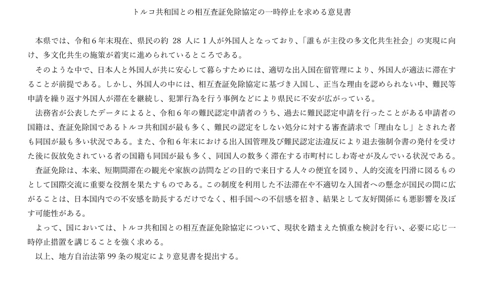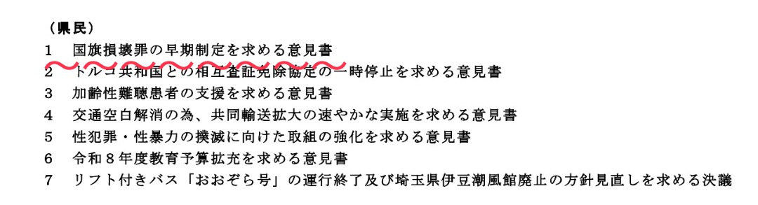 合わせて提出した『トルコ共和国との相互査証免除協定の一時停止を求める意見書』も自民党議員団が賛同せず見送りになりました。