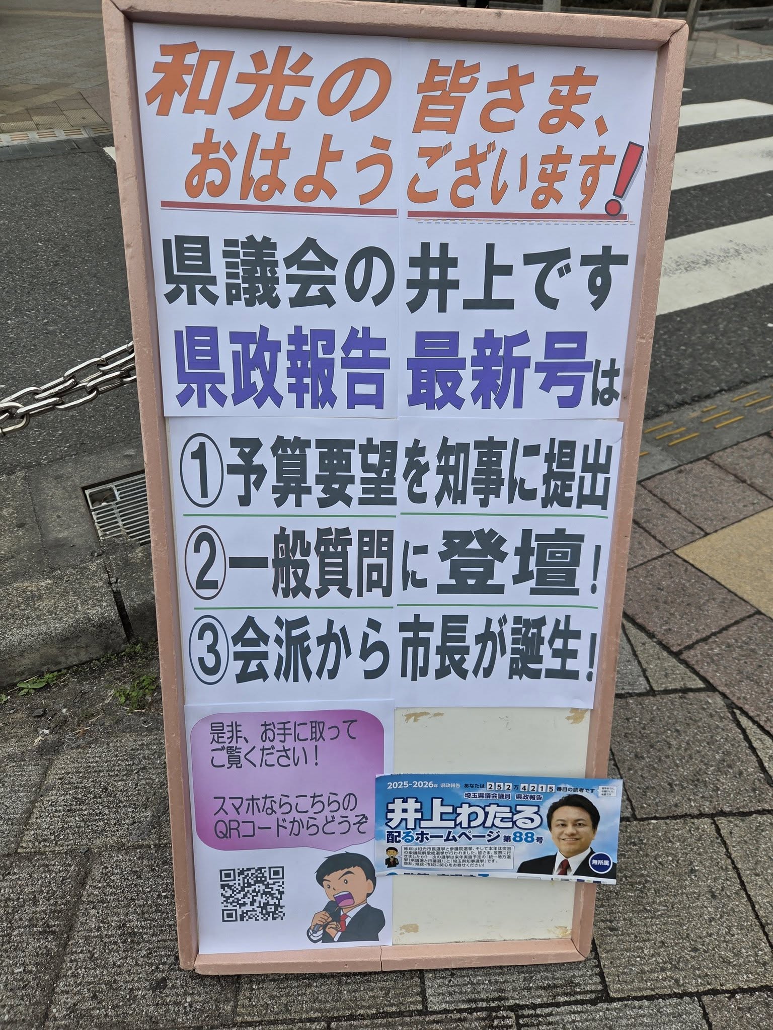 今朝は「配るホームページ第88号」を持っての駅立ちです。