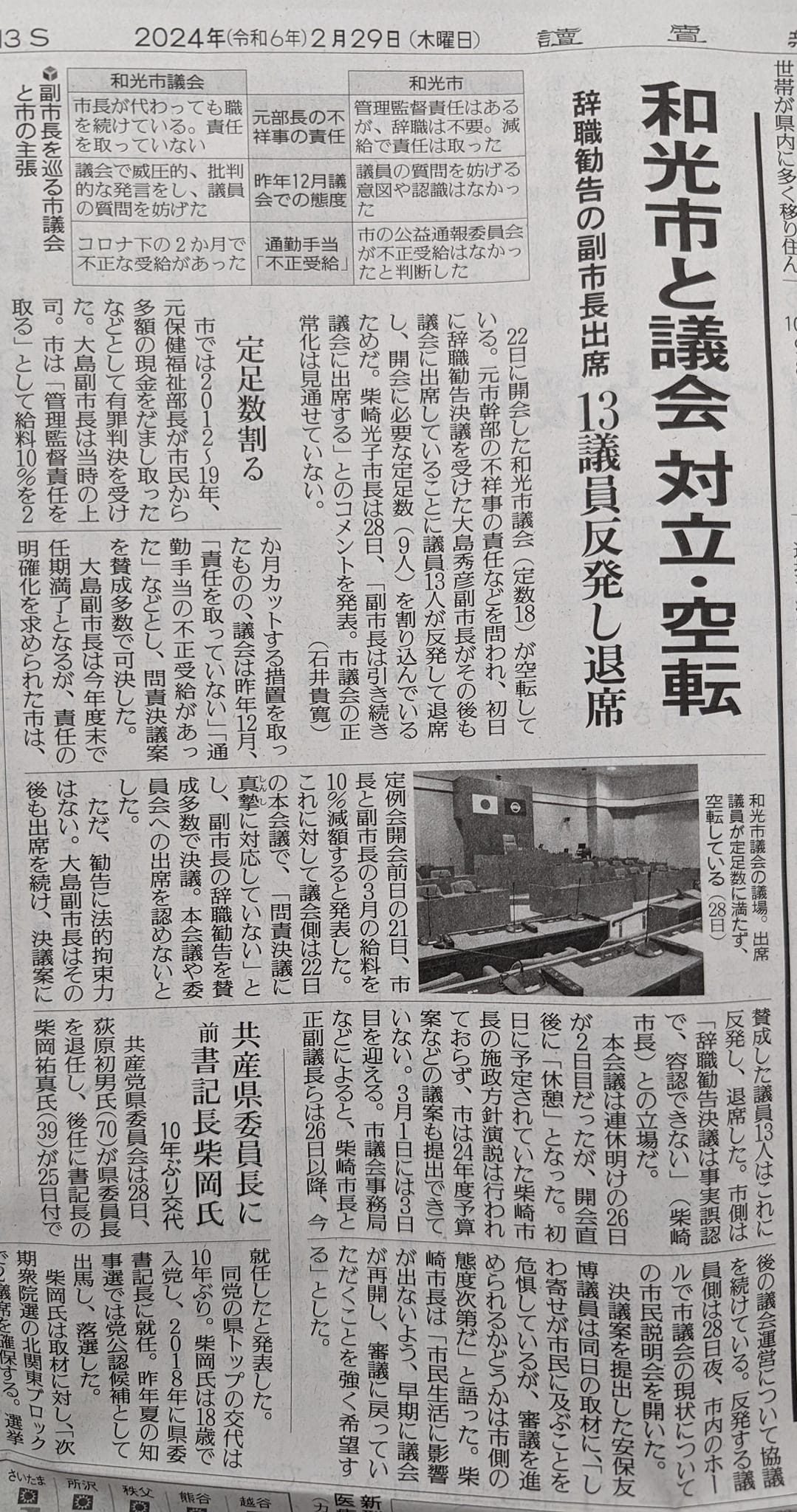 一方、報道等でご承知の方も居ると思いますが、現在、和光市議会は副市長の議会出席を巡り、議会と執行部の折り合いがつかず、3月議会が空転状態です。